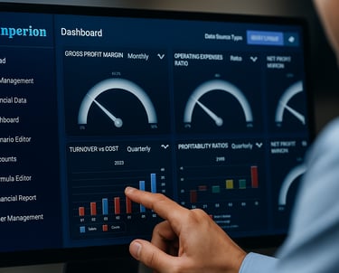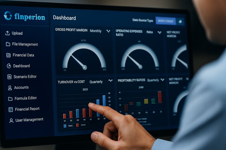 Instantly understand your companyβs performance with interactive charts, tables, and key ratios. Finperion turns your raw data into meaningful insight.